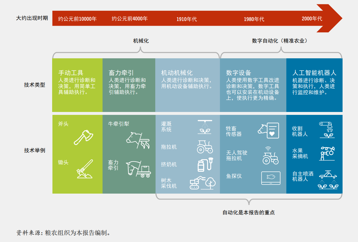 农业自动化在本报告中的定义是在农业作业中使用机械和设备,以期改进诊断、决策或执行,降低农业劳动的繁重性和/或提高农业作业的及时性,甚至于精准性。