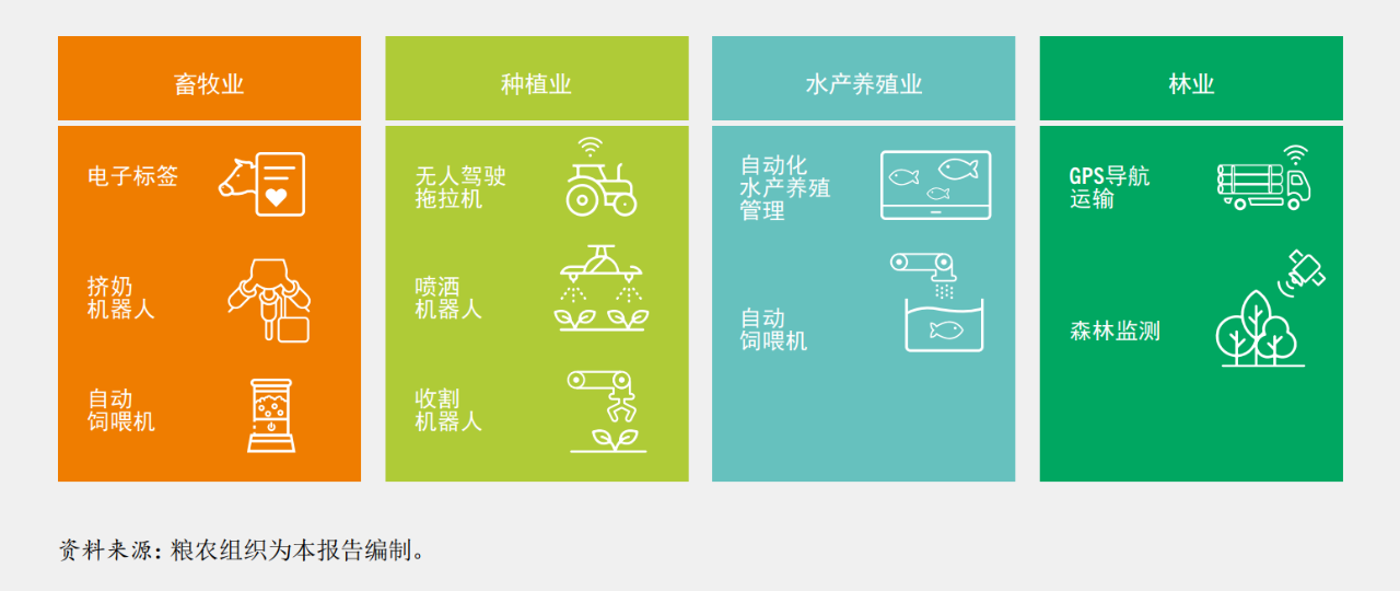 数字技术和人工智能机器人技术在农业生产系统中的部分应用。©粮农组织/《2022年粮食及农业状况》报告